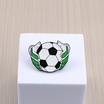 Pin de esmalte elegante de manos enguantadas acunando una pelota de fútbol. Con guantes verdes llamativos y la clásica bola blanca y negra